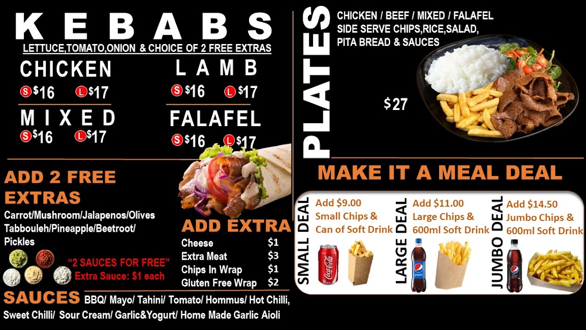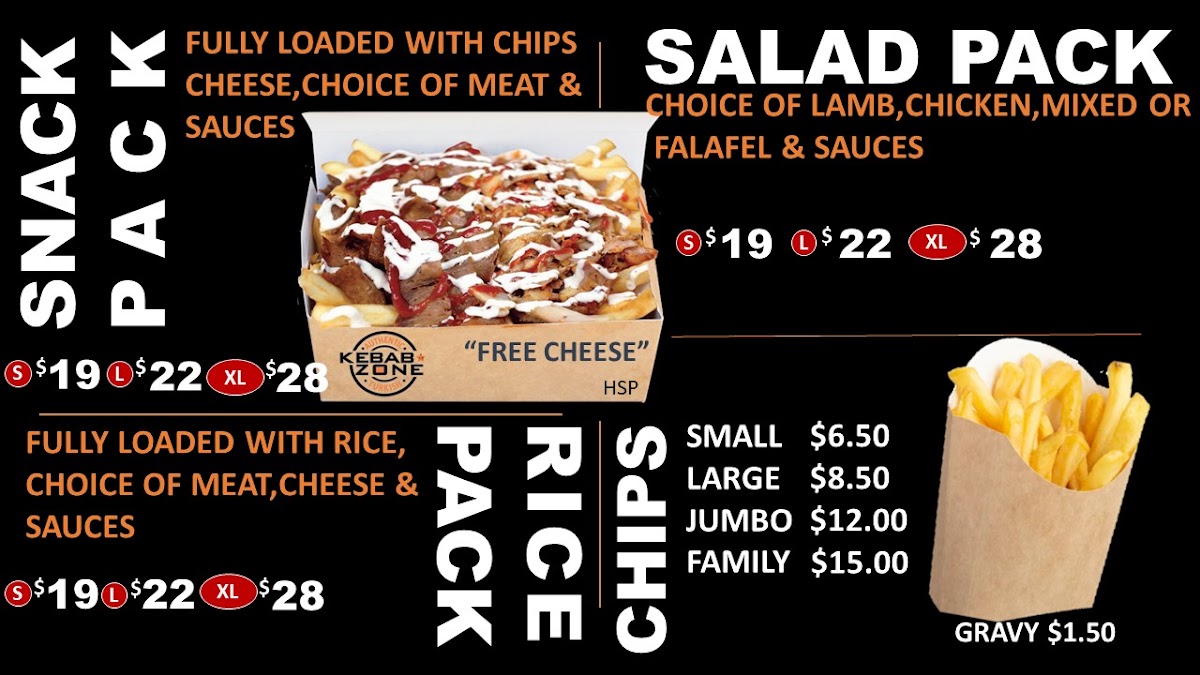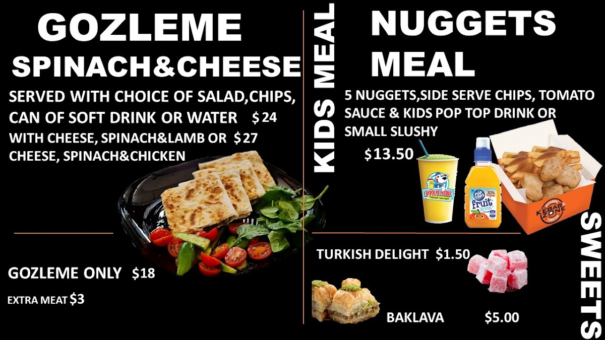 Kebabzone Baringa offers a menu that is both diverse and approachable, catering to a range of tastes and dietary needs. For those seeking gluten-free options, the Gluten Free KEBABS like Chicken Kebab, Salad Kebab, and Falafel Kebab provide satisfying choices. Their Kebab Plates-including Mixed Kebab Plate, Falafel Kebab Plate, Beef & Lamb Kebab Plate, and Chicken Kebab Plate-deliver generous portions perfect for a hearty meal. Families will appreciate the Kids Deal, featuring 5 Pieces Nuggets, Chips & Pop Top Kids Drink, while the Zone Packs such as Rice Pack, Snack Pack (HSP), and Salad Pack offer convenient options for sharing. The Gozleme Plates, like Lamb And Beef With Spinach, Spinach & Cheese, and Chicken And Spinach, bring a unique twist with their filled flatbreads. A variety of Drinks-from Water (600 Ml) and Kids Pop Tops to Soft Drinks (600 Ml) and Soft Drink (375 Ml Can)-complement any meal, alongside Chips in sizes ranging from Small Chips to Family Chips. Classic Kebabs such as Salad Kebab, Mix Kebab (Chicken, Beef & Lamb), Beef & Lamb Kebab, Falafel Kebab, and Chicken Kebab remain the highlight for kebab enthusiasts. Finally, the menu rounds off with indulgent Sweets like Turkish Delight and Baklava, offering a sweet finish to a satisfying dining experience. Overall, Kebabzone Baringa’s menu impresses with variety, generous portions, and thoughtful options for both individuals and families.